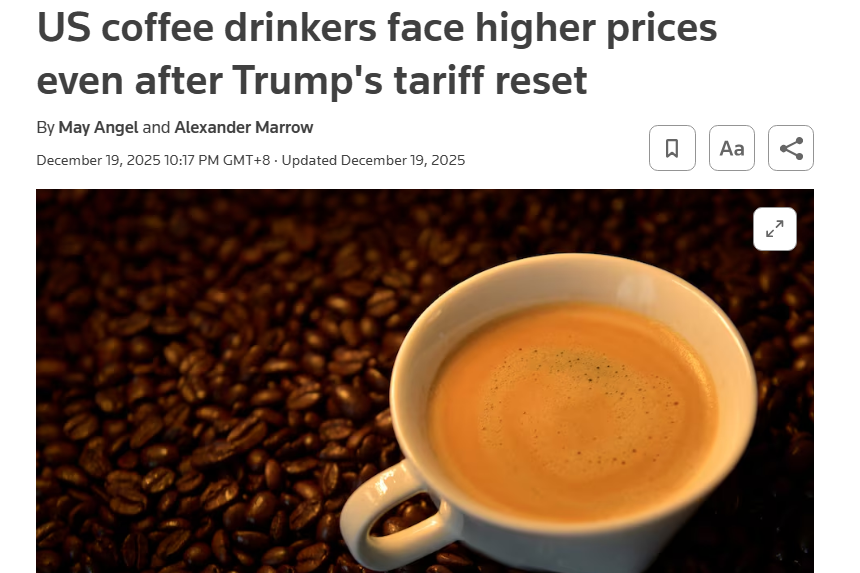 路透社最近报道称,尽管美国政府在11月份取消了部分食品进口关税,但对美国消费者来说仍然很艰难。短期内咖啡价格将大幅下跌。业内人士指出,关税的成本是叠加在此前原材料价格上涨之上的,这些影响在供应链上“有滞后性”,零售端的价格压力尚未完全释放。这种滞后效应也意味着现任美国政府的难度越来越大。以在明年中期选举前缓解通胀压力。 △路透社报道截图指出,美国政府今夏大范围征收进口关税,涵盖巴西等主要咖啡生产国,推高了咖啡豆价格。独立咖啡分析师 Christopher Phelan 表示,因为烘焙、融化库存以及与零售商进行价格谈判的周期通常是复杂的。每季度进行一次,咖啡成本的上涨通常需要至少九个月的时间才能转嫁给消费者。路透社强调,目前零售端咖啡价格的上涨反映的不仅仅是原料市场前期高位的影响。由于连续几期减产和恶劣天气,咖啡豆供应持续紧张,这是推动当前价格的主要因素。数据显示,截至今年11月的一年里,美国咖啡零售价格上涨了18.8%,其中只有一小部分可以归因于关税。在美国政府加征关税期间(8月至11月),咖啡豆的价格上涨了近35%。然而,与关税相关的成本增加尚未完全反映在超市货架上,“配送仍然滞后”。报道指出,今年11月,民主党在新泽西州等州赢得选举由于纽约州和弗吉尼亚州选民对食品价格越来越不满,本届美国政府取消了对咖啡等“美国难以生产”的200多种食品征收的10%至41%的所谓“互惠关税”。路透社指出,即便如此,作为全球最大的咖啡消费国,美国消费者预计仍将不得不长期忍受咖啡的高价。因此,白宫也将面临一个艰巨的挑战:如何在2026年11月美国中期选举之前遏制食品价格上涨带来的通胀压力。 上一篇:专访丨西班牙与中国坚持开放合作,为欧中关系 下一篇:没有了